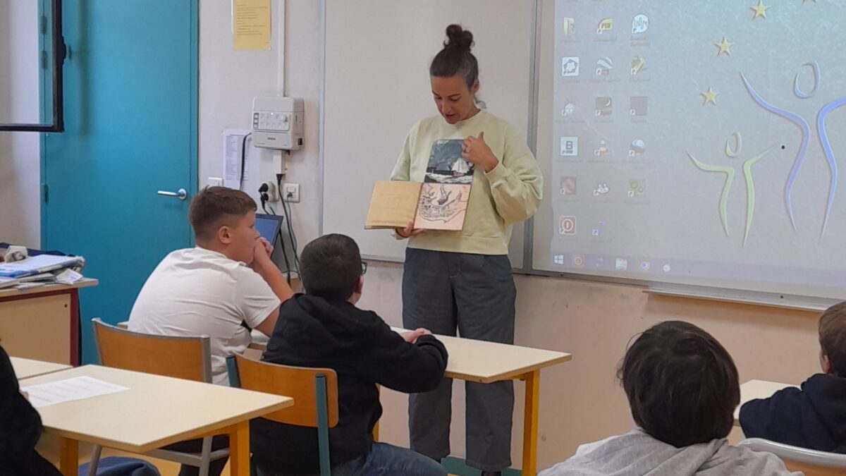 Elle nous a proposé une activité ludique : dans une double page de l’album, elle avait ôté les bulles et les dialogues et il s’agissait pour nous d’imaginer les paroles des personnages. La rencontre s’est terminée par une séance de dédicaces. Lucas n’avait pas le livre mais a fait dédicacer sa double page !