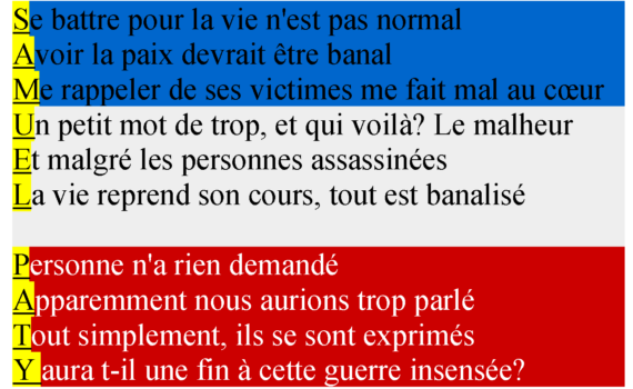 Dans ce lycée Où personne n’avait rien demandé Malheureusement cet homme a été tué Intervenant pour éviter plus de blessés Nouvelle cible des terroristes Injuste et si triste Quelles sont les raisons ? Un acte de rébellion ? Ecrit dans l’histoire de notre pays Bien malheureux jour Enseignant comme Samuel Paty Réduit à néant à son tour Nous ne comprenons pas pourquoi… Arras est sans voix Restons soudés Défendons la laïcité Kiara Auguste (4eme)