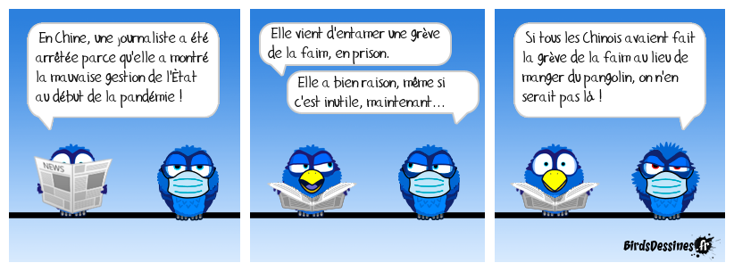 Zhang Zhan est une journaliste chinoise et une lanceuse d’alerte (une personne ou un groupe qui essaye d’avertir d’un danger. Il agit pour le bien du plus grand nombre de personnes mais contre l’intérêt de certains…) : journaliste, son rôle est d’avertir la population, alors elle se rend à Wuhan pour filmer la quarantaine et les conditions chaotiques de l’hôpital qui est surchargé. Malheureusement pour elle, en Chine, la presse est censurée et les journalistes ne peuvent pas écrire tout ce qu’ils veulent. Elle publie ses vidéos le 12 mai 2020 et est arrêtée le 13 mai, soit moins de 24 heures après la publication de ses vidéos.