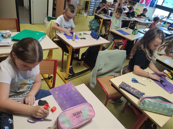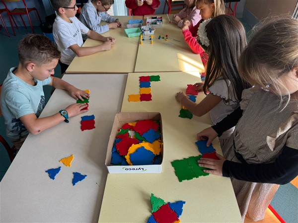 La manipulation est aussi importante en géométrie. Ici, en atelier, les élèves de CE2 ont pu passer des patrons aux solides à travers diverses activités très appréciées.