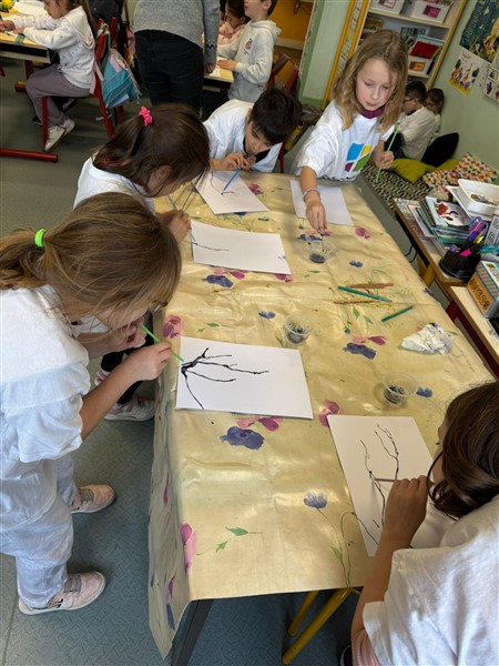 Les élèves de CE2 ont créé des cerisiers japonais en fleurs à l’aide de la technique de l’encre soufflée puis en ajoutant des points de couleur pour parfaire les fleurs de cerisier. Magnifique travail qui a beaucoup plu aux élèves.