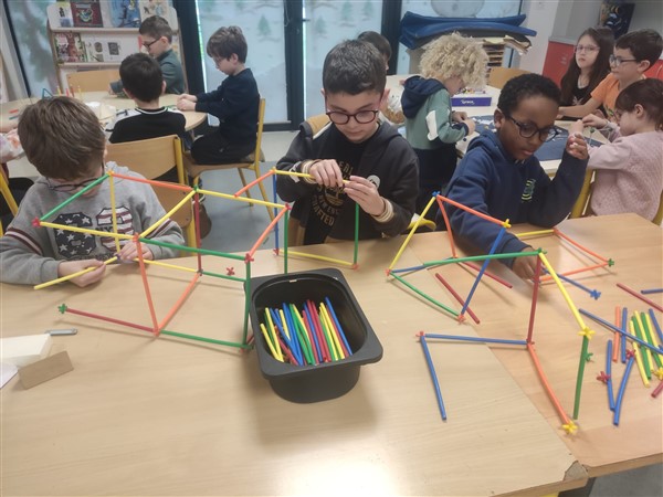 Reconnaissance, tri, classement, construction, les élèves ont manipuler les solides pour mieux les découvrir et entrevoir leurs propriétés. Beaucoup de matériel, géomag, polydrons, formes aimantées, construction avec des pailles, solides…