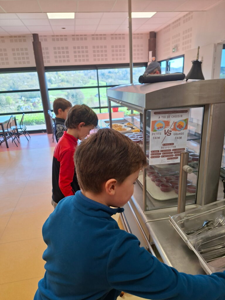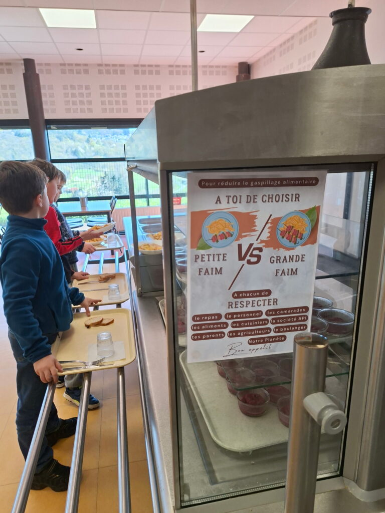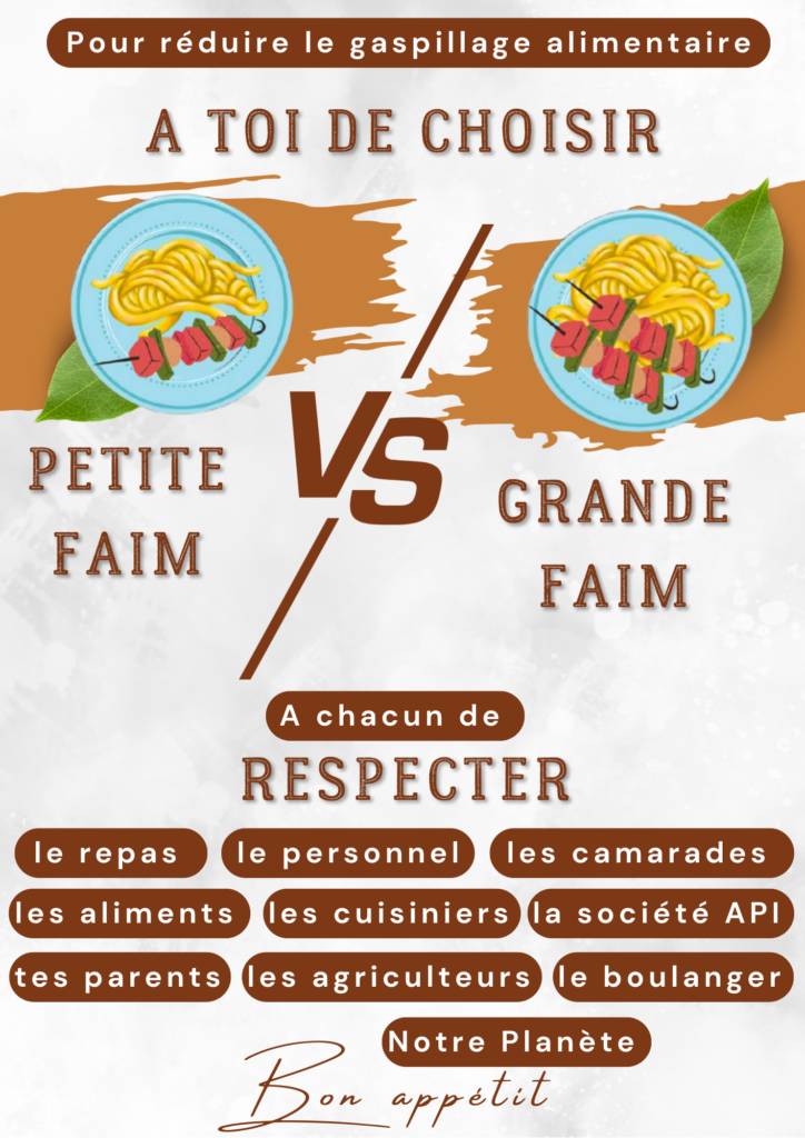Les dernières réunions, il a aussi été question de gaspillage alimentaire. Les élèves ont proposé de demander des petites ou grandes assiettes en fonction de leur faim ou de leur goût pour moins jeter. Ils ont réalisé une affiche pour inciter leur camarade à être plus responsable au moment du repas.