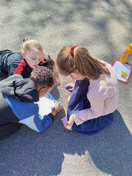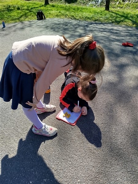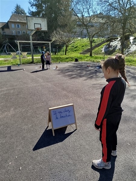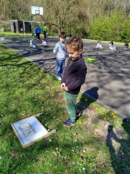 Les CP ont participé à un relai copie par équipe alors que les grandes sections devaient reproduire, avec un nombre de déplacements limité, une forme géométrique complexe dont le modèle était placé à plusieurs mètres.