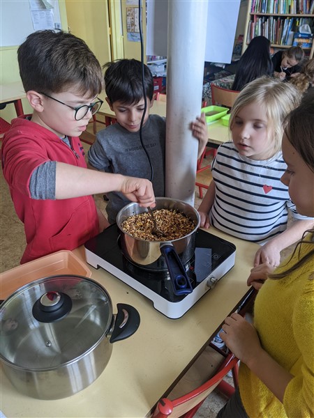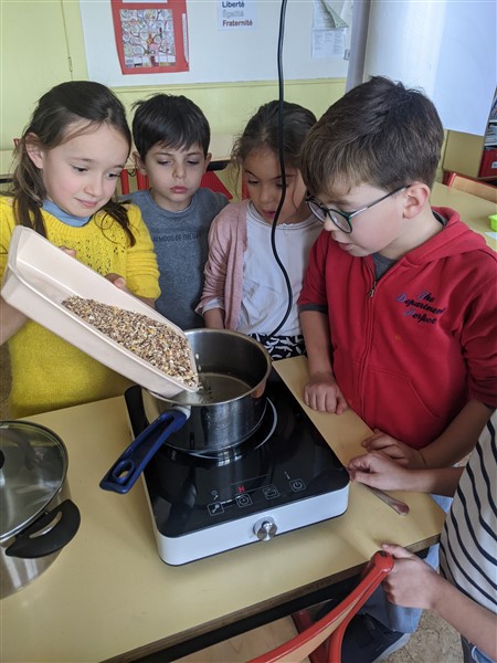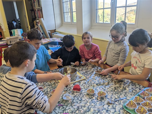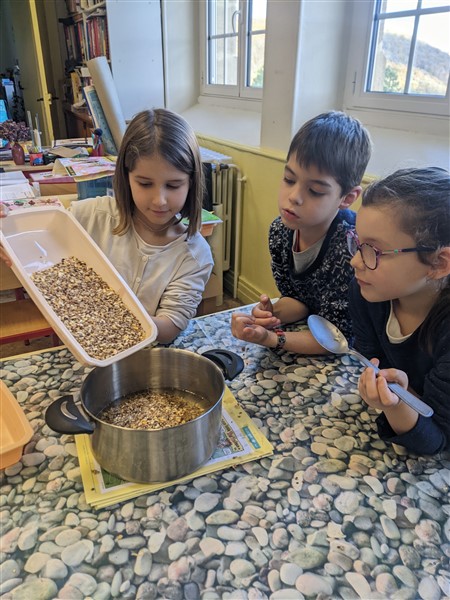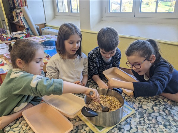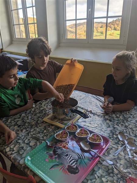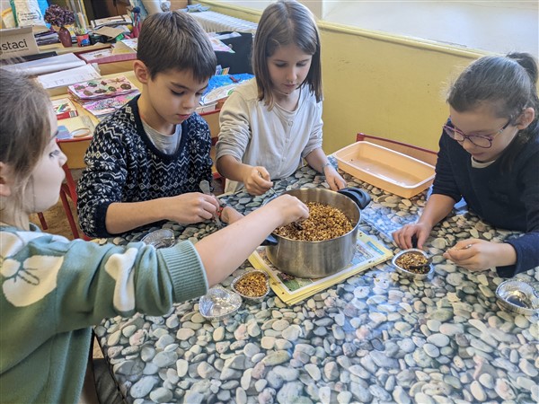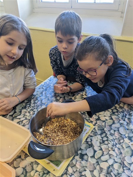 Les élèves de CE1 ont réalisé des moulages de graisse et graines pour fabriquer des cœurs pour nourrir les oiseaux cet hiver.