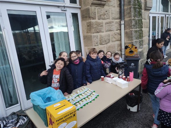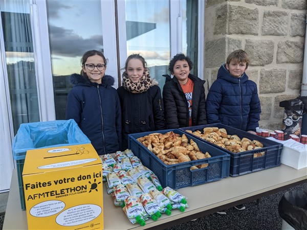 Les CM2 de la commission « Solidarité », Joanne, Méonnie, Mohamed-Yasin et Noé ont organisé ce goûter au profit du Téléthon.