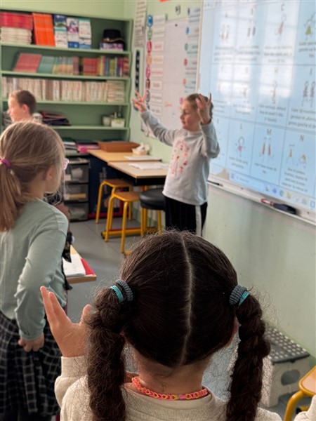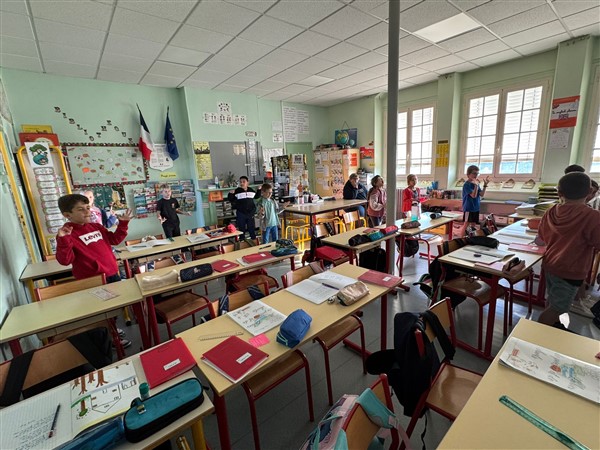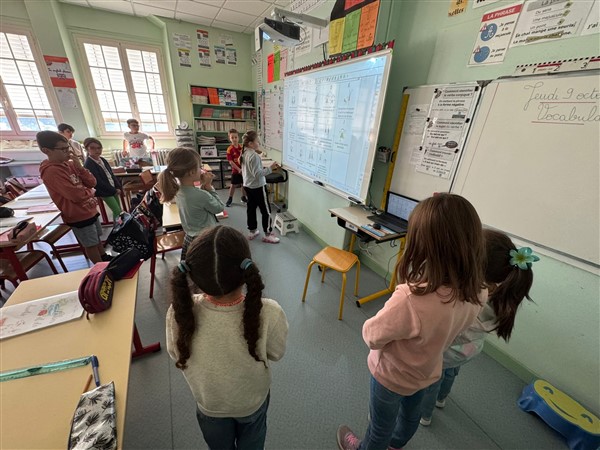 Pour permettre au corps et à la tête de faire une pause, les élèves de CE2 s’activent sur le rythme d’une chanson en anglais qui fait actionner différentes parties du corps.