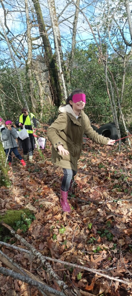 Avec sa stagiaire Lana, Thomas avait préparé un atelier pour la classe sur le thème de la forêt. Celui-ci a débuté par une expérience sensorielle appelée « la ligne de vie » : yeux bandés et seulement guidés par une ligne à tenir à une main, les élèves passaient un à un sur un parcours qui a mis leurs autres sens à contribution.