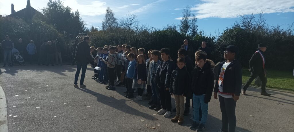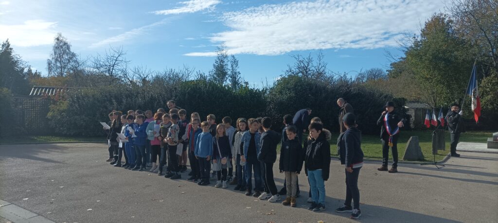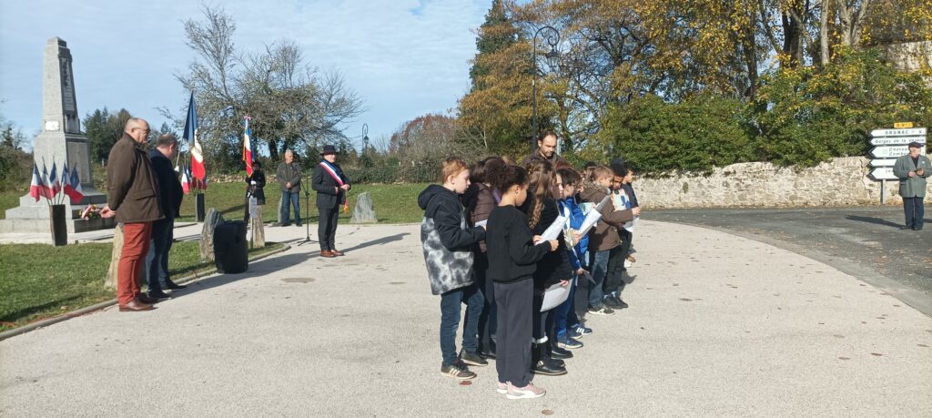 Rassemblés autour du monument aux morts, les élèves de la classe de CM1-CM2 ont lu des extraits du roman Les Croix de bois de Roland Dorgelès. Les élèves de la classe de CE2-CM1 ont poursuivi la cérémonie en interprétant les premiers couplets de La Marseillaise.