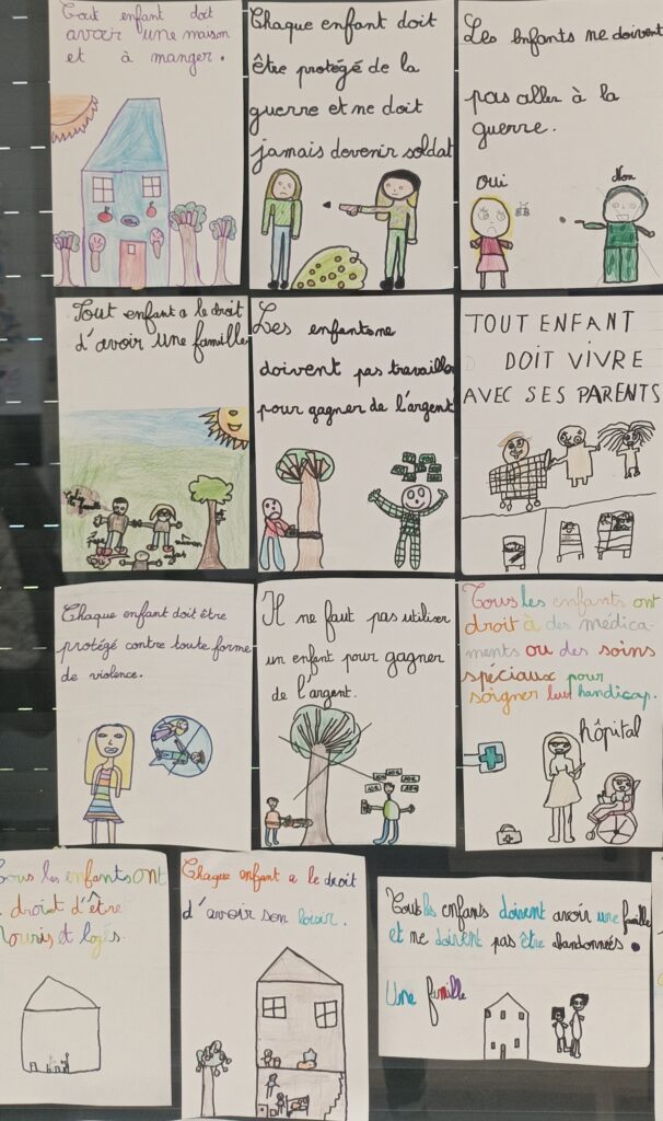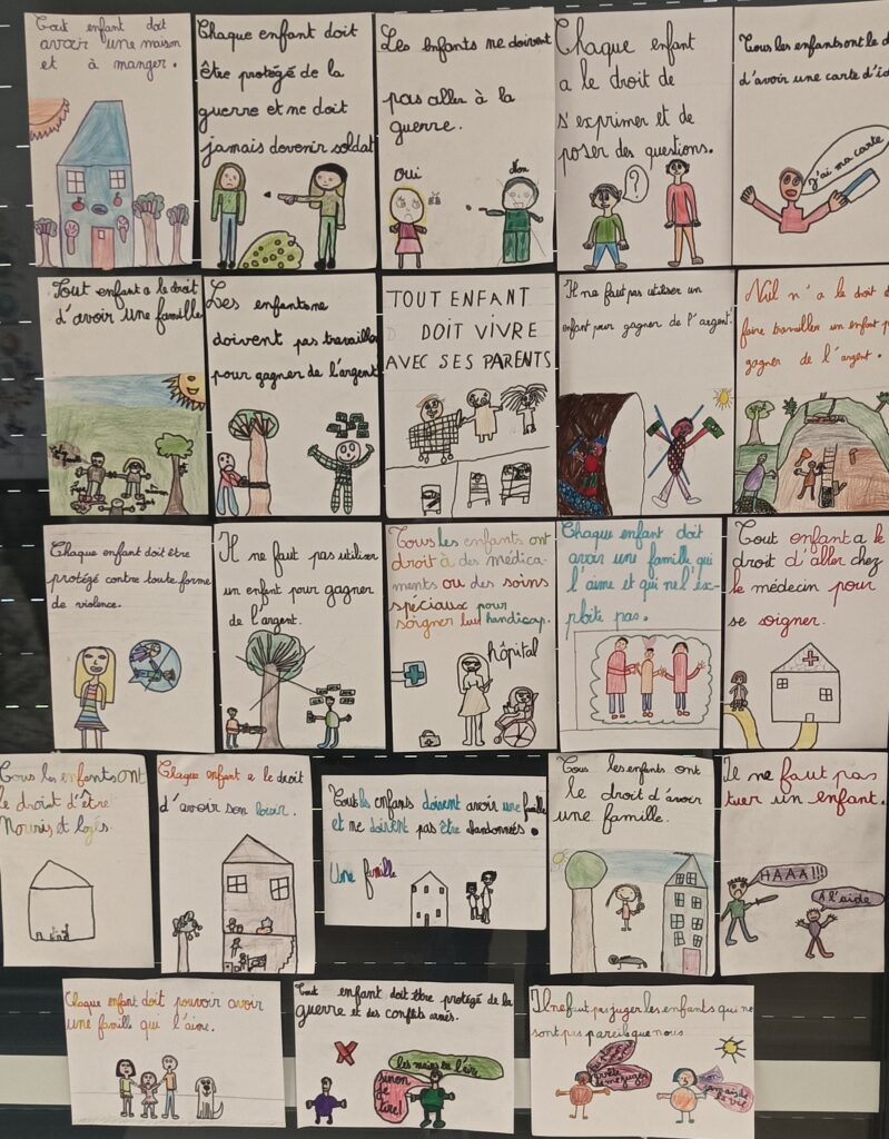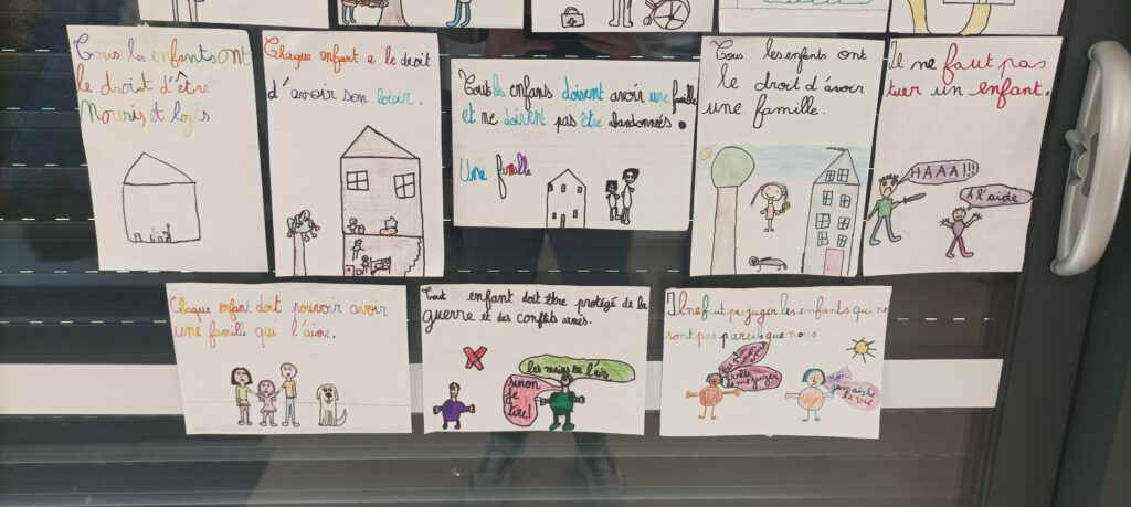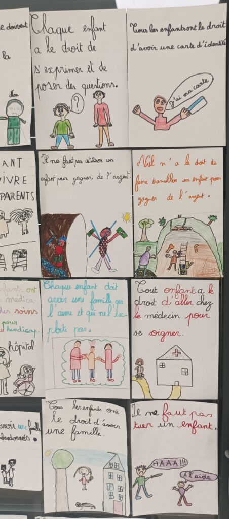 Les élèves de la classe de CE2-CM1 ont travaillé cette période sur le thème des droits de l’enfant en lien avec les nouveaux programmes EVAR de l’école élémentaire (Enseignement à la vie affective et relationnelle) et le sous-domaine : connaître mes droits.