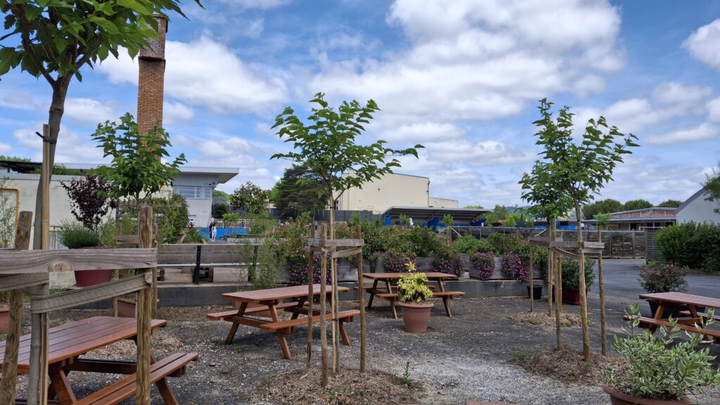 On peut voir des sièges et tables pour pouvoir travailler en plein air, et il y a des tables de pique-nique pour les professeurs derrière le CDI.
