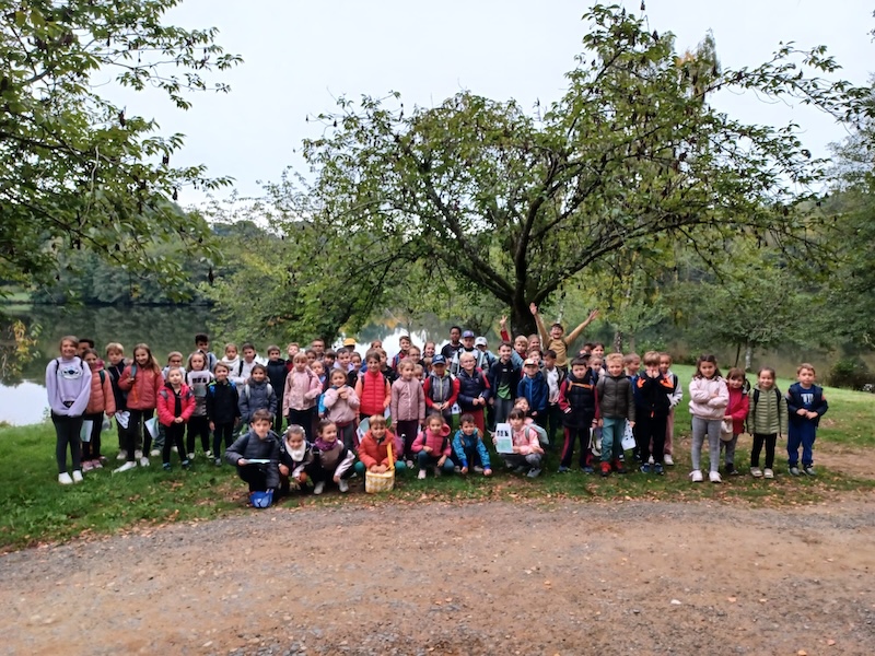 On retrouve les élèves d’Estivaux, pour une photo souvenir, posant avec leurs cartes complétées et leur butin de l’automne.