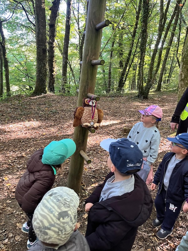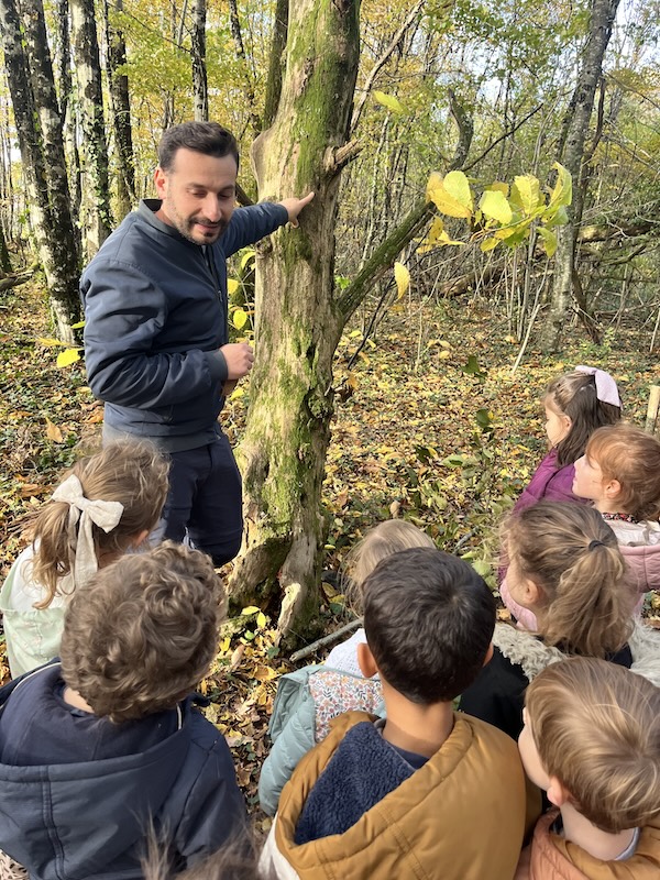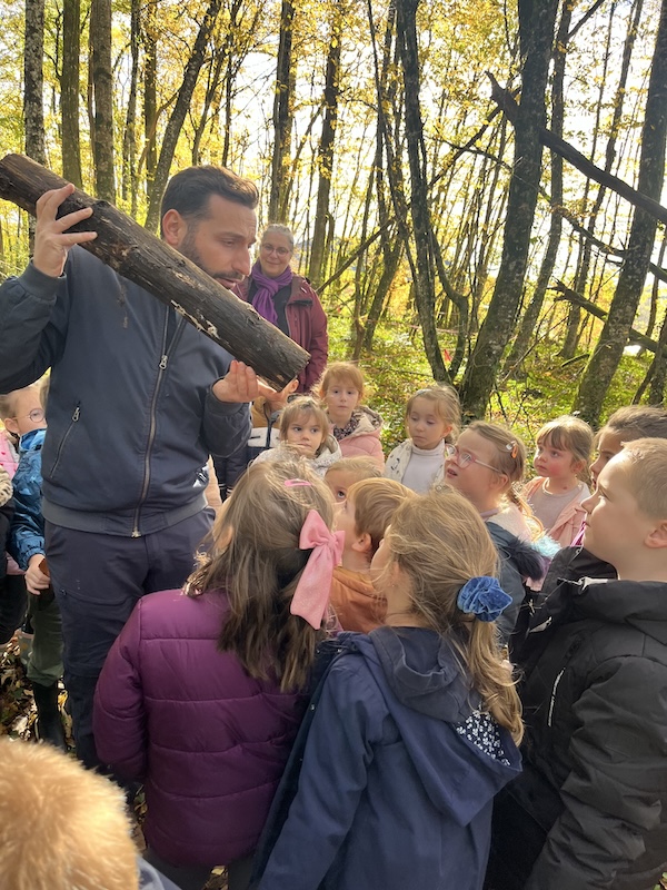 Le 4 novembre, au cours de l’après-midi, les élèves de grande section ont rejoint Thomas, à l’orée du Petit Bois, tout près du Château d’eau, afin de suivre un atelier organisé en extérieur. L’intervenant avait prévu trois activités autour de l’automne et des trésors de la forêt.