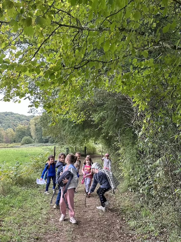 Un plan avec des repères matérialisés sous forme de photos retraçait le trajet que les enfants devaient suivre, ainsi que les endroits emblématiques à croiser sur leur passage. Par groupe de quatre, tous niveaux mélangés, ils étaient chargés de les identifier, mais aussi de ramasser un élément correspondant au décor automnal. Ainsi, ils ont récolté des feuilles de chêne, bogues et châtaignes, noix, feuilles de lierre, houx… Tous se sont prêtés au jeu et ont consolidé le vocabulaire utilisé pour décrire les alentours.
