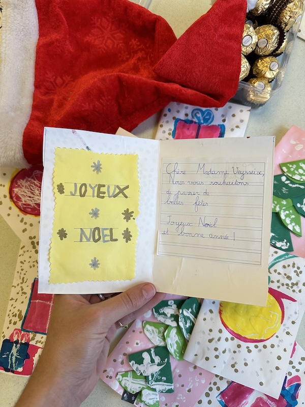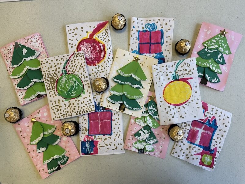 Les élèves de Grande section et les CP ont préparé cette semaine des cartes pour les résidents. Un joli travail collaboratif de peinture, d’écriture et de collage. Des sapins, des boules ou des cadeaux ornent les couvertures. Plein de couleurs vives pour les fêtes !