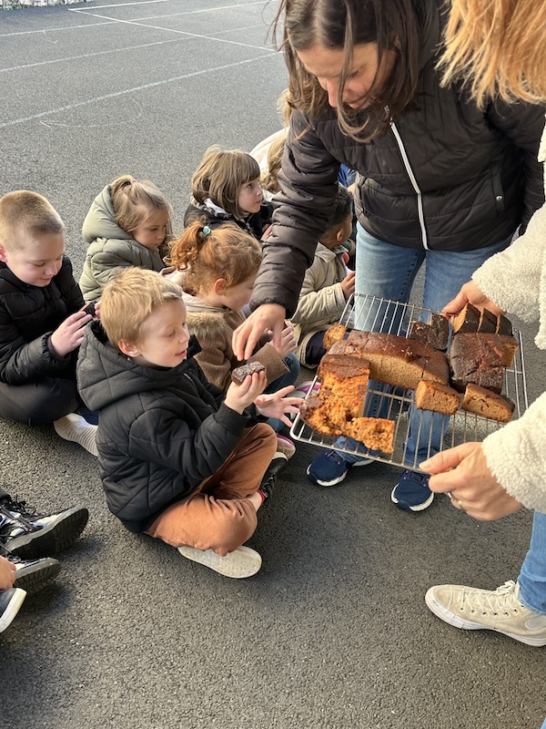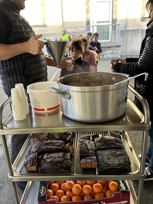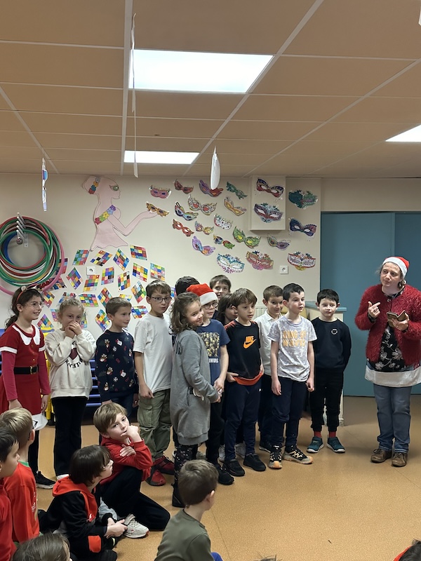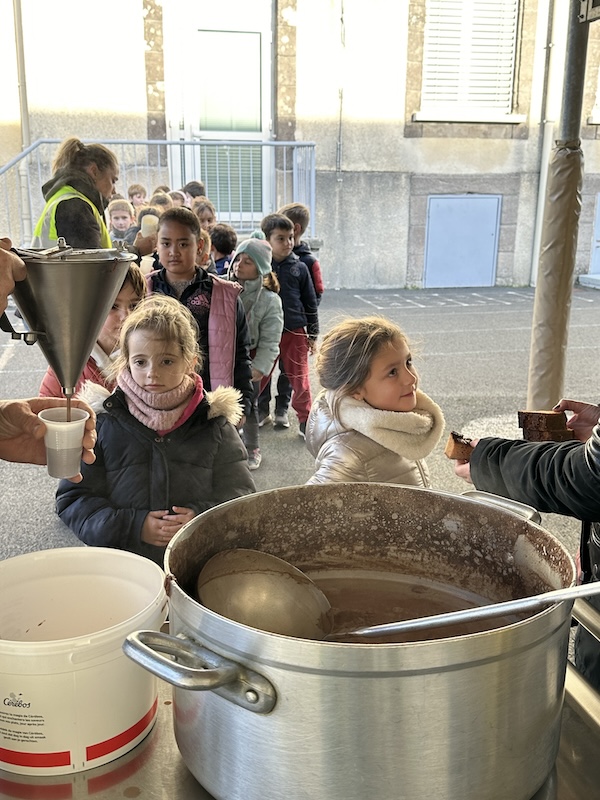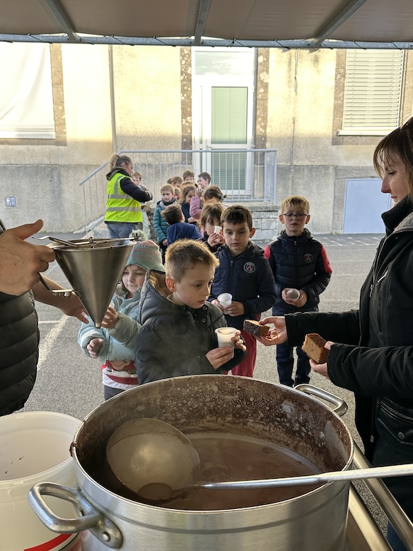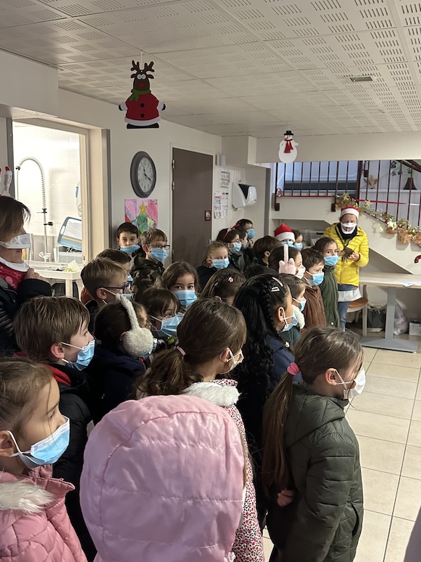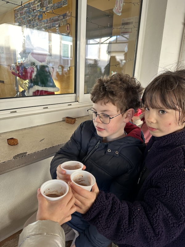 Nous sommes rentrés et avons eu le plaisir d’être récompensés par un délicieux goûter de Noël. Les petites et moyennes sections nous ont rejoint pour partager le réconfort du chocolat chaud élaboré et servi par David, accompagné d’un morceau du pain d’épices préparé lundi, par les élèves eux-mêmes.