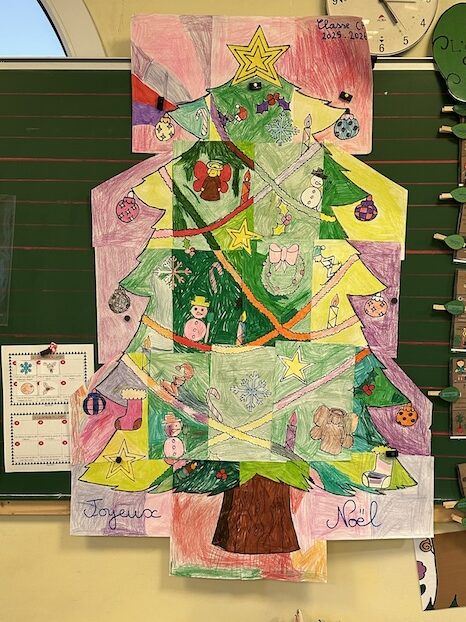 Le magnifique sapin de Noël réalisé par les élèves de CP, tout en couleurs et en collage. Il a immédiatement trouvé sa place à l’EHPAD, comme si les résidents l’attendaient.