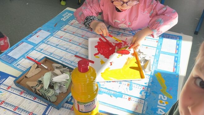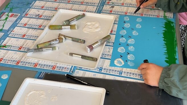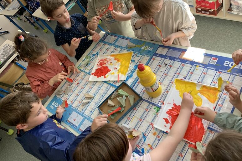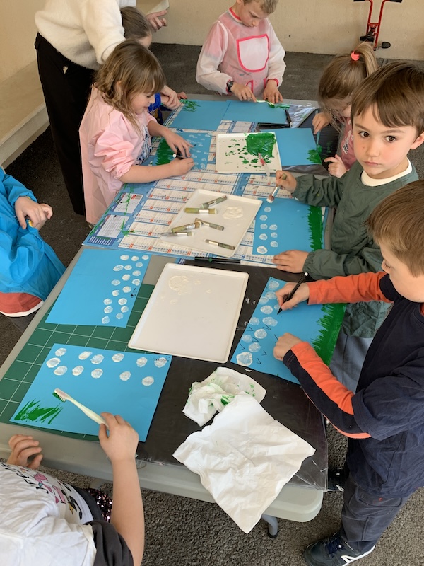 Le mardi après-midi, alors que le soleil était de sortie, nous nous sommes répartis en deux ateliers : un dans la classe, un à l’extérieur. Au programme : peinture ! Mais avec différentes techniques bien sûr.