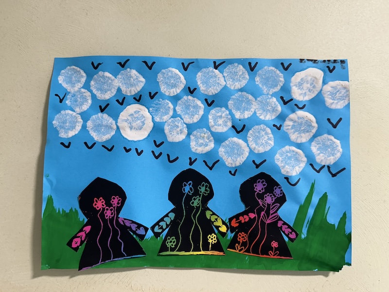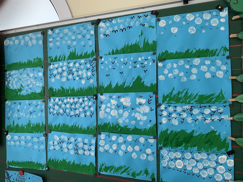 Pour une magnifique production en deux dimensions, je demande : un fond couleur du ciel, des brosses à dent pour hacher l’herbe verte, de gros pinceaux pour les nuages duveteux et enfin, milles hirondelles au feutre noir. Le jour suivant, nous avons découpé du papier à gratter pour créer une farandole d’enfants. Nous les avons sertis de jolies fleurs de toutes les couleurs.