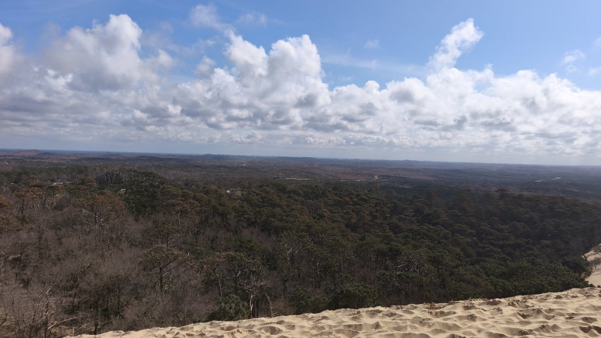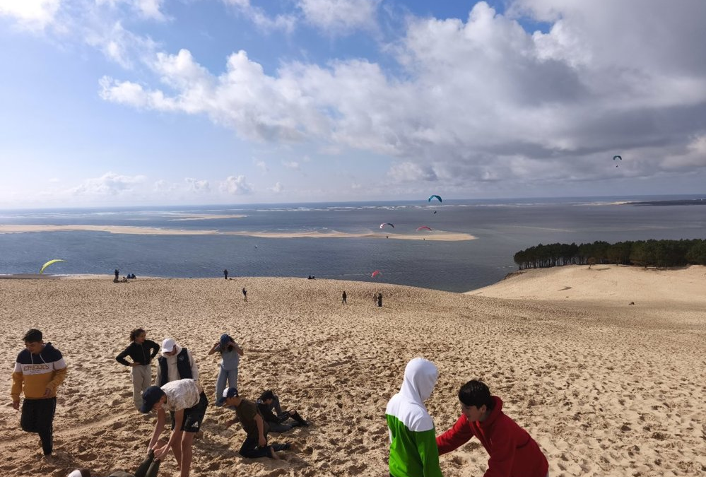 Après un trajet en bus nous sommes descendus pour une petite randonnée à travers les forêts des Landes de Gascogne, pour finir sur la plage de Biscarosse. Un guide nous a expliqué l’utilité des pins maritimes et la raison de leur présence ici . Les pins maritimes ont été planté sous l’ordre de Louis Napoléon lll. Avant cette forêt, Les Landes était un espace « désert » où personne ne pouvait cultiver. Ainsi, il a commandé d’y planter des pins maritimes car ces arbres s’enracinent, poussent et peuvent être coupés pour la production de bois. De plus, cette forêt empêche l’avancée de la dune.
