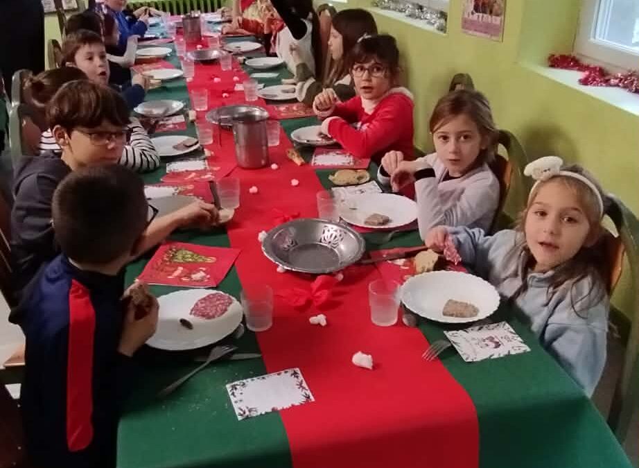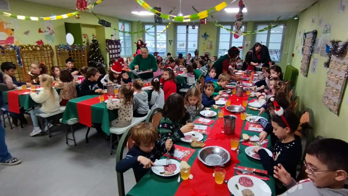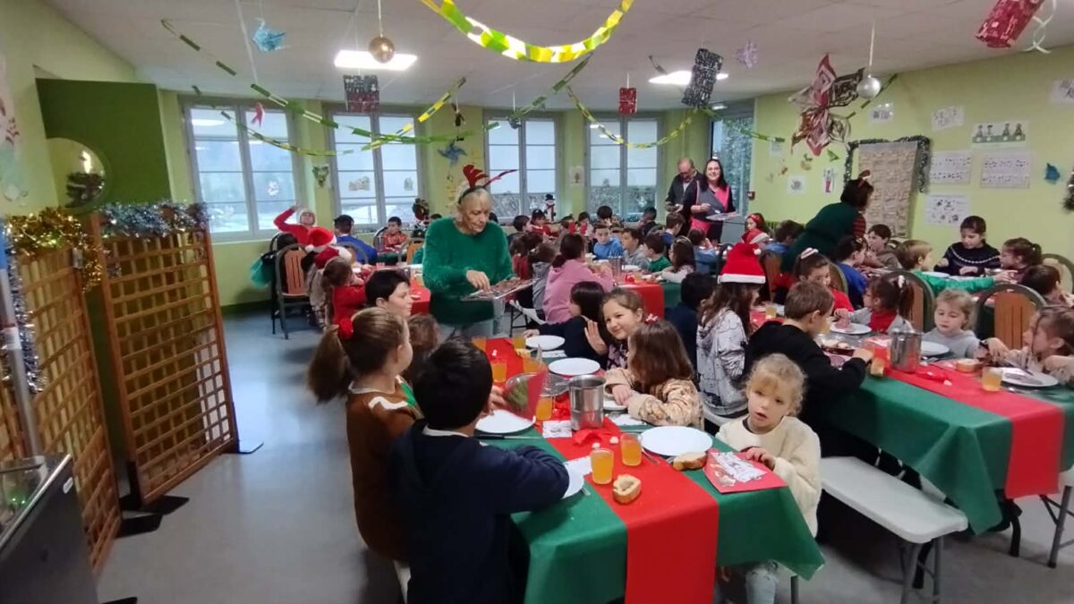 Pour le repas de midi, les élèves ont eux-mêmes constitué leurs tables de 6 ou de 8, en mélangeant les classes. Ce moment de partage a permis à tous les enfants de déjeuner ensemble, pas forcément avec les élèves de leur propre classe. Un délicieux repas de Noël a été préparé par nos cantinières, Ingrid et Naka, que nous remercions pour ce festin très apprécié.