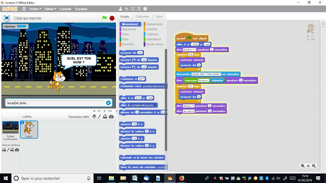 Nous avons appris à déplacer, tourner, faire parler et répondre des lutins (mot employé pour désigner un objet ou un personnage sur le logiciel). Ensuite,nous avons réalisé un petit film d’animation avec tout ce que nous avons appris.