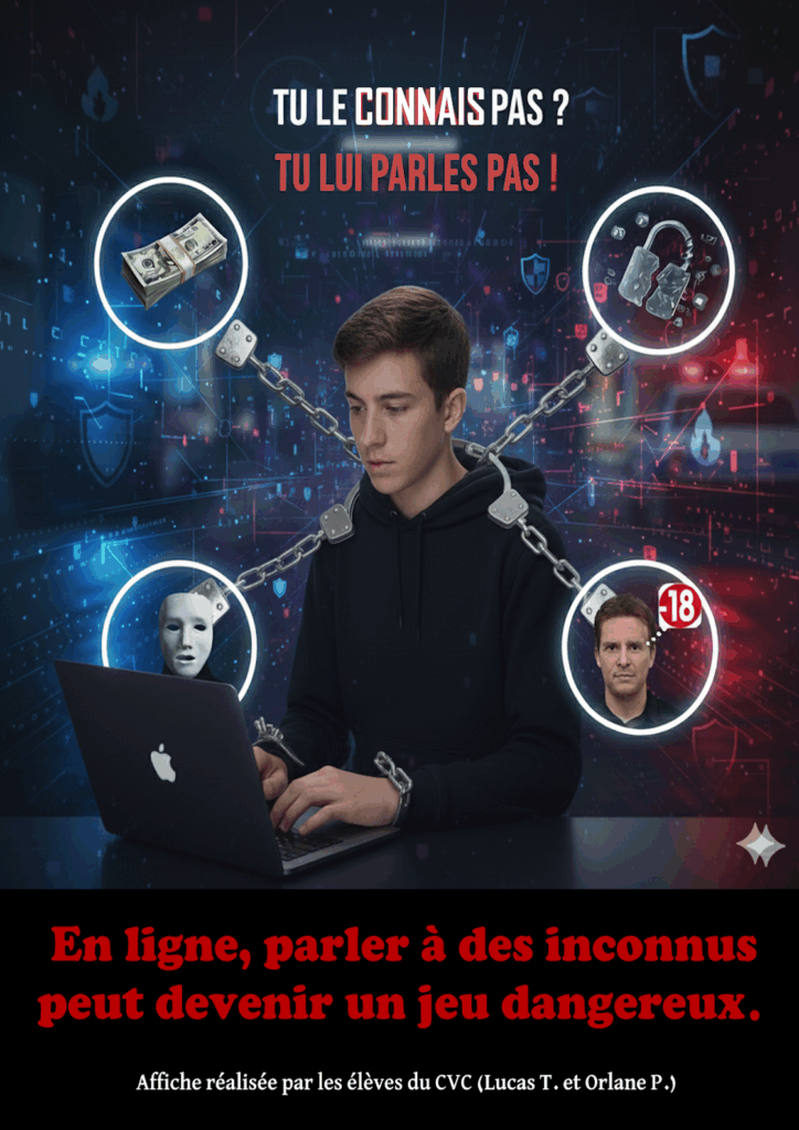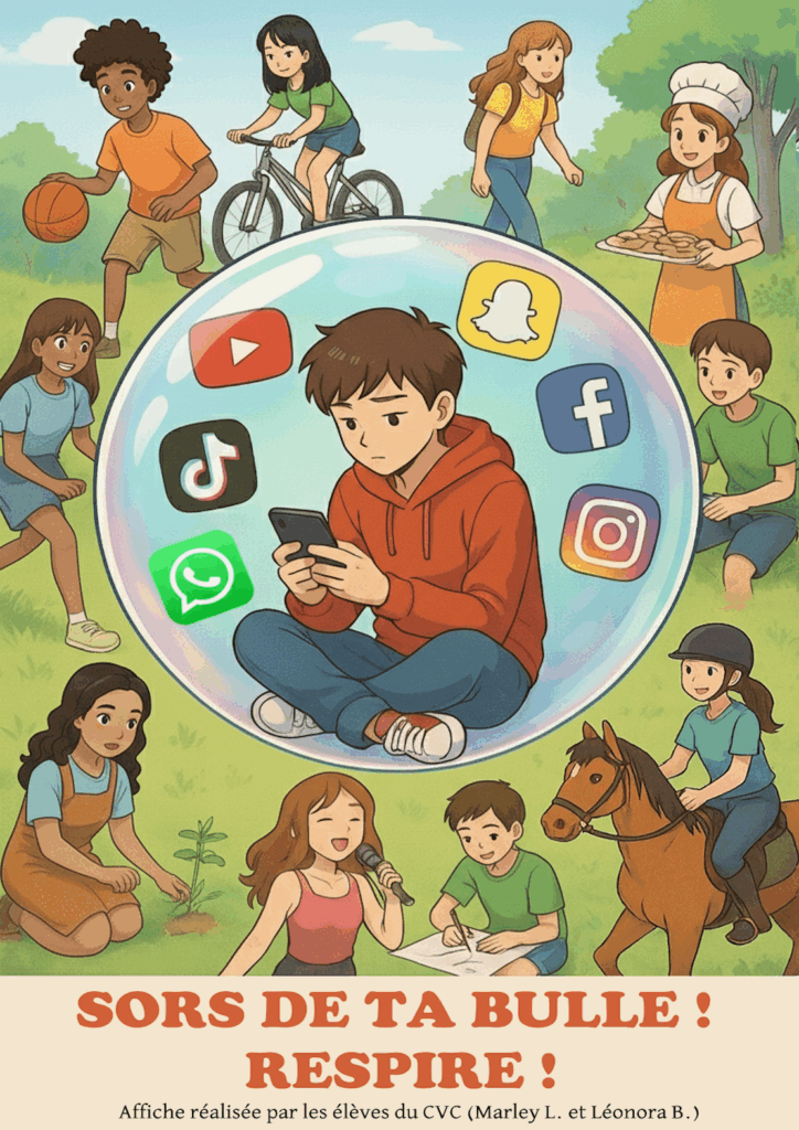 Le but de ce projet est de sensibiliser les élèves aux pratiques responsables sur Internet. Les élèves ont créé six affiches sur différents thèmes : protéger ses données, se méfier des inconnus, gérer son temps d’écran, préférer les outils numériques reconditionnés et se protéger du cyberharcèlement grâce au numéro national 3018.