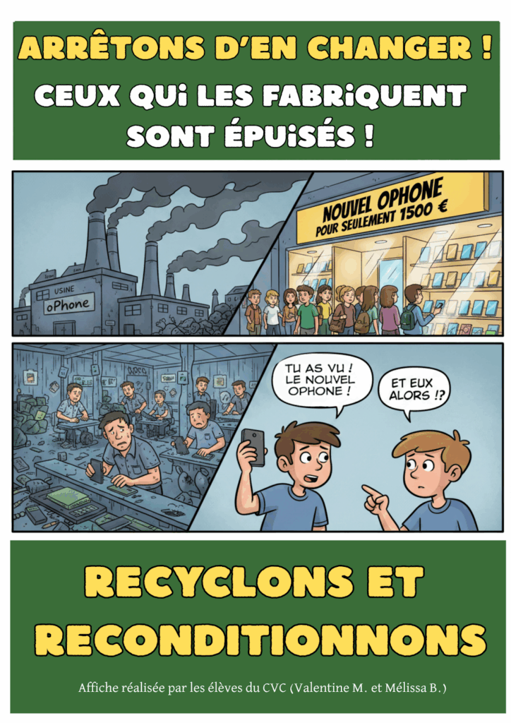 Les affiches ont été créées avec l’IA Gemini après un travail de conception en groupes : choix du thème, du slogan et de la composition de l’affiche au brouillon, avant de passer à la création sur ordinateur.
