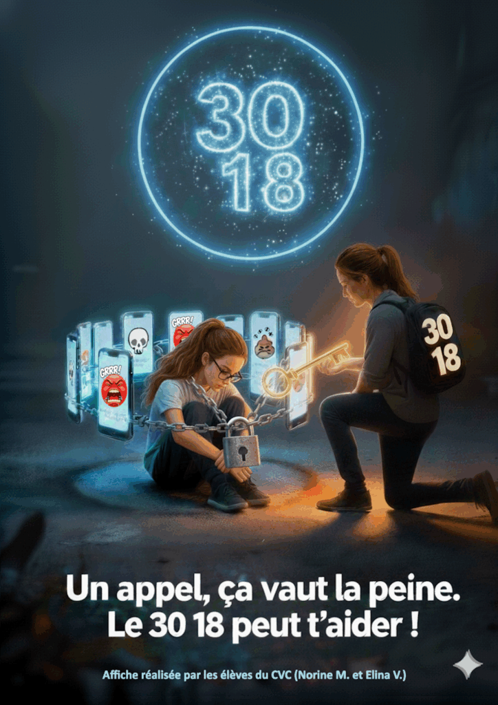 Nous sommes également très heureux de vous annoncer que l’affiche de Norine et Elina (sur le 3018) a remporté le prix académique de la meilleure affiche du prix « Non au harcèlement », dans la catégorie « cyberharcèlement ».