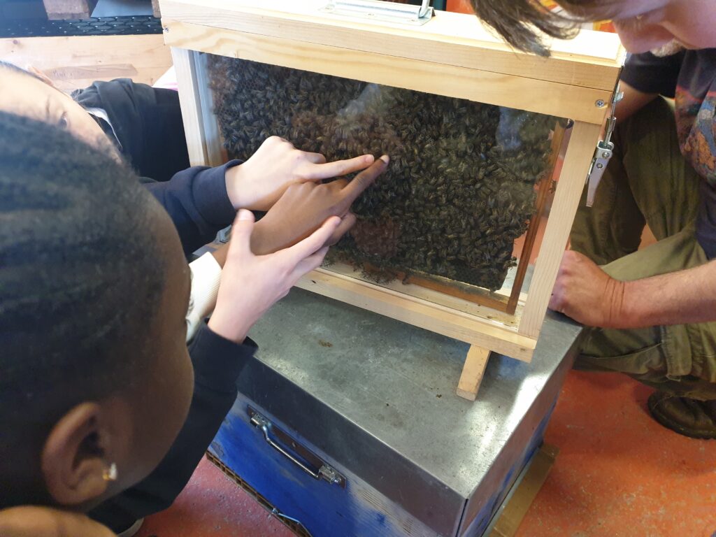 Eric DUFOUR nous a présenté son métier d’apiculteur, le développement des abeilles, leur vie en colonie et leur rôle dans la pollinisation et nous a fait observer une ruche vitrée. Parmi les abeilles se trouvaient la reine que l’on distinguait car elle avait été marquée d’un point et qu’elle était plus grande et plus orange.