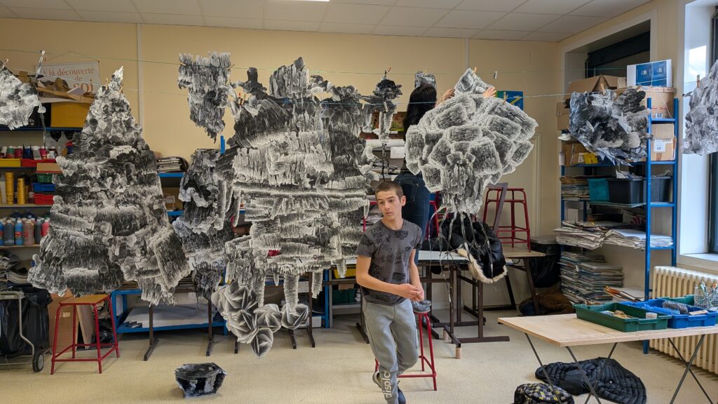 Le fil conducteur de ces deux journées était la porcelaine et les roches et minéraux qui la composent, notamment le Kaolin. Plusieurs temps d’échange ont permis de découvrir l’univers de l’artiste ainsi que sa démarche et ont servi d’amorce aux différentes activités. Les élèves ont pu travailler à partir de photocopies de vues microscopiques de kaolin dans le but de créer de grandes figures de papier découpé et assemblé, comme autant de fragments d’un paysage flottant. D’autre part, ils ont réalisé des pièces de porcelaine là encore en cherchant à s’interresser à cette question du fragment. En juin un 3ème temps d’atelier permettra d’apporter la touche finale aux réalisations.