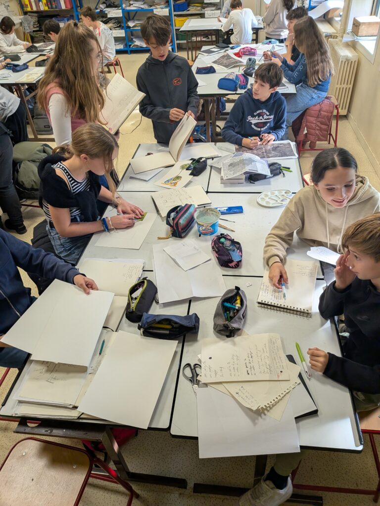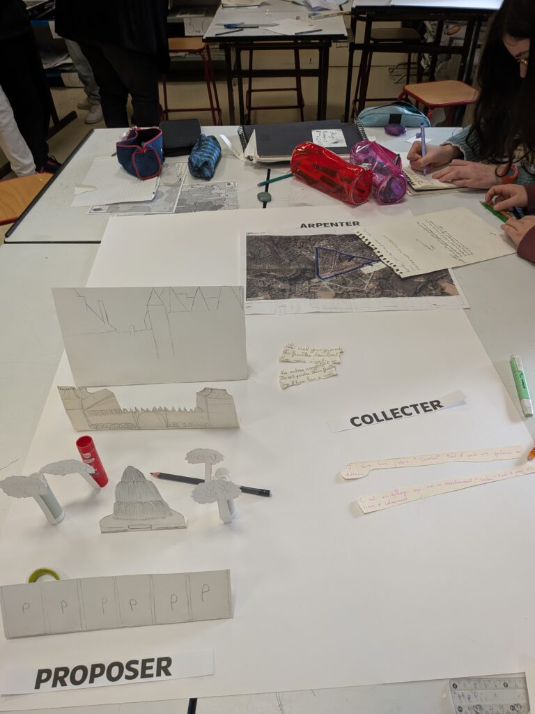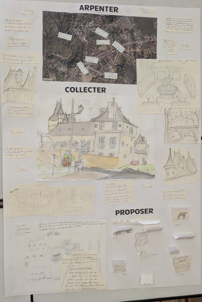 Dans la foulée de l’atelier à Jumilhac-le-Grand, les 5ème CHAAP ont réalisé en groupe des posters à partir de 3 verbes : arpenter/collecter/proposer. 3 verbes qui reprennent les 3 temps de la journée passée sur le terrain. Il s’agit pour les élèves d’apprendre à sélectionner, à hiérarchiser et à organiser visuellement des éléments disparates.