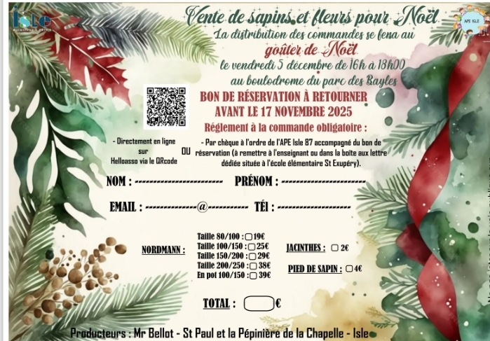 L’ Amicale des Parents d’Elèves vous propose une vente de sapin et fleurs de Noël. Pensez à commander avant le 17 novembre 2025.